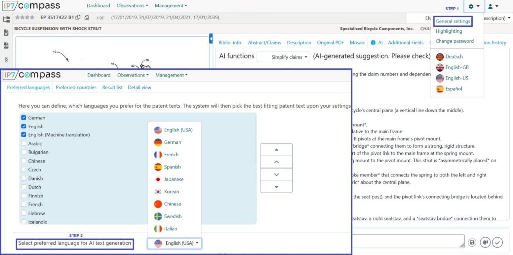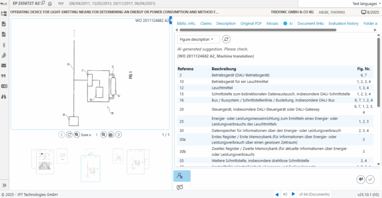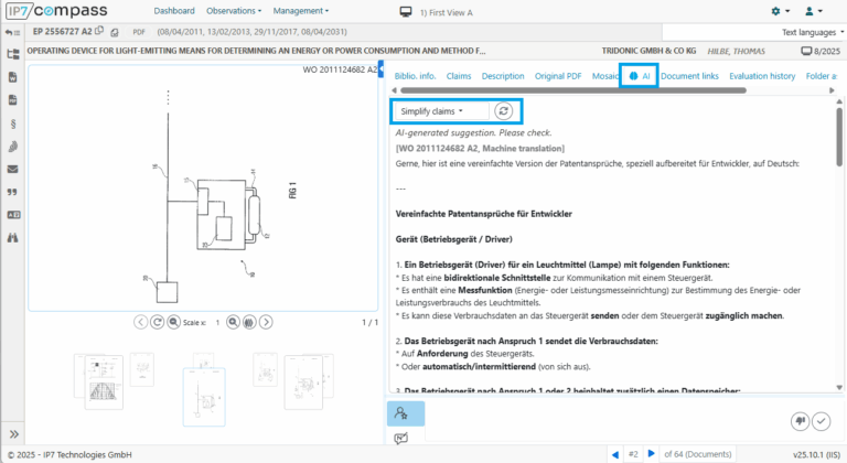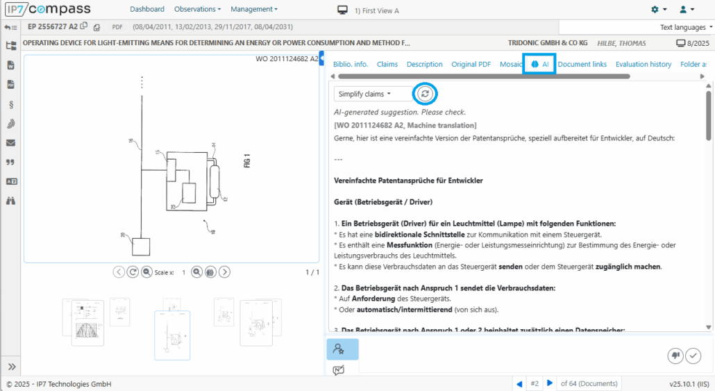 Once you have selected a function and clicked on “Start AI function,” the currently loaded patent is automatically analyzed and the result is displayed immediately.