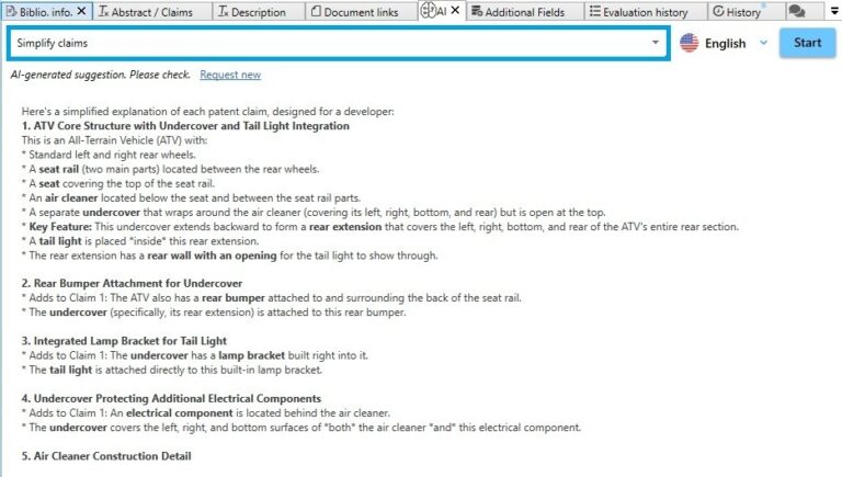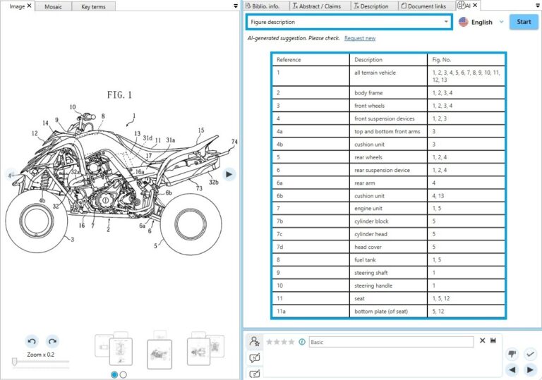 With the help of AI, the reference symbols (references) of figures are determined from the patent and presented in tabular form with the corresponding description. The Fig. No. column indicates in which figure the reference symbol can still be found.