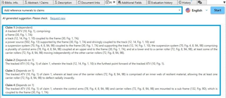 Thanks to the use of AI, the AI tab in the detailed view now allows you to display the reference symbols of the figures directly in the claims – even if they are not explicitly mentioned in the claim texts.